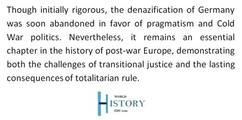 However, the legacy of denazification is not without its darker aspects. The amnesty laws passed in the 1950s, which allowed many former Nazis to reintegrate into society, were controversial and led to accusations that Germany had not fully come to terms with its past. The persistence of right-wing extremism and xenophobia in contemporary Germany is a reminder that the demons of the past have not been completely exorcised. The debate over how to remember and commemorate the Holocaust continues to be a sensitive and contentious issue, reflecting the ongoing struggle to reconcile the past with the present. Moreover, the experiences of denazification offer valuable lessons for other societies grappling with the aftermath of conflict and repression. The challenges of balancing justice with reconciliation, of holding perpetrators accountable while reintegrating them into society, and of fostering a culture of remembrance without succumbing to collective guilt are all issues that resonate far beyond the borders of Germany. The German experience serves as a cautionary tale, highlighting the difficulties of confronting a dark past and the importance of vigilance in safeguarding democratic values. It also underscores the need for a comprehensive and multifaceted approach to transitional justice, one that combines legal accountability with truth-telling, reconciliation, and education. The long-term success of any denazification effort depends not only on the removal of individuals from power but also on the transformation of societal attitudes and beliefs. It requires a sustained commitment to democratic values, a willingness to confront uncomfortable truths, and a collective determination to prevent the recurrence of past atrocities. The legacy of denazification in Germany continues to shape the country’s identity and its role in the world, serving as a reminder of the enduring power of the past and the ongoing struggle to build a more just and peaceful future.