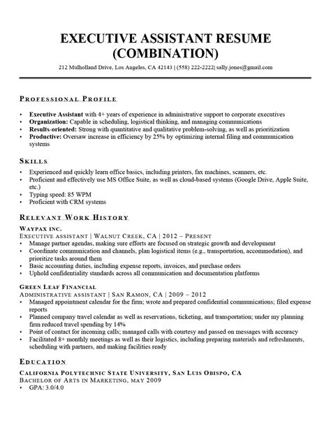 • Highlight Relevant Skills: Identify the skills that are most relevant to the executive administrative assistant role, such as organizational skills, communication skills, time management, and proficiency in office software.
