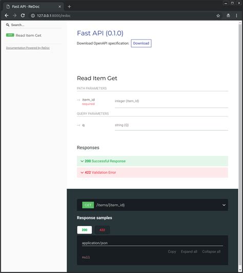 To access the interactive API documentation, open your web browser and go to http://127.0.0.1:8000/docs . You should see the Swagger UI, which provides a visual interface for exploring your API.