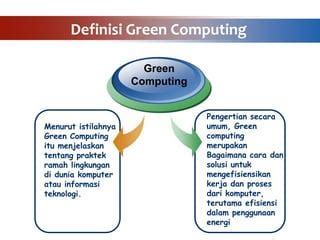 Green computing , yang juga dikenal sebagai green IT , adalah bidang yang berfokus pada minimisasi dampak lingkungan dari penggunaan komputer dan sistem informasi. Ini mencakup berbagai praktik, termasuk desain, manufaktur, penggunaan, dan pembuangan perangkat keras dan perangkat lunak komputer dengan cara yang ramah lingkungan. Tujuan utamanya adalah untuk mengurangi konsumsi energi, meminimalkan limbah elektronik (e-waste), dan mengurangi emisi karbon yang terkait dengan operasi TI.