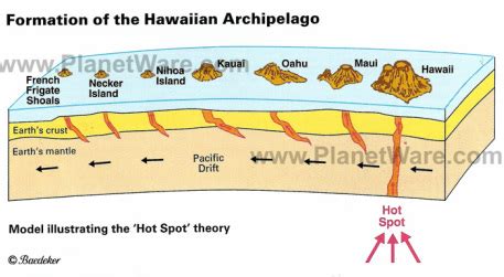 • Formation of the Island Chain : The Hawaiian Islands illustrate perfectly how hotspots create a chain of volcanoes. As the Pacific Plate moves northwest, each island forms over the hotspot and then gradually becomes extinct as it moves away. This process is responsible for creating a chain of islands that stretches for over 3,000 miles, providing a clear record of the Pacific Plate’s movement over millions of years.