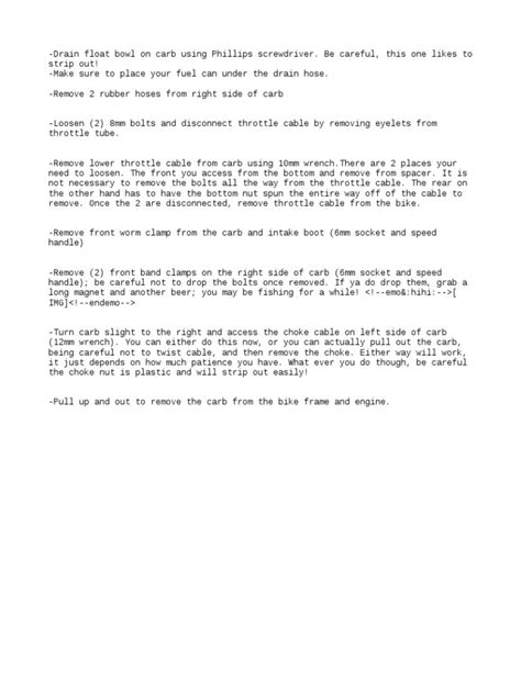 Alright, with the prep work done, let’s get into the nitty-gritty of removing that carburetor . This part requires a bit of patience and attention to detail, so take your time and don’t rush. First, you’ll need to disconnect the throttle cables. These are usually located on the side of the carburetor. Loosen the cable adjusters and carefully detach the cables from their linkages. Pay close attention to how they’re connected – you’ll need to remember this when you reinstall the carb. Next up are the fuel lines. There’s usually a fuel line coming from the fuel tank to the carb. Use pliers to loosen the clamp and gently pull the fuel line off the carb. Be prepared for a little bit of fuel spillage, even if you drained the carb earlier. Have a rag handy to clean up any mess. Now, disconnect any other hoses or wires connected to the carburetor. This might include vent hoses, sensors, or other small tubes. Again, take note of where each one goes – a picture can be super helpful here. With all the cables and hoses disconnected, it’s time to loosen the clamps holding the carb to the intake manifold and airbox. These clamps are usually tightened with screws or bolts. Loosen them enough so you can wiggle the carb free. Once the clamps are loose, carefully wiggle the carburetor back and forth while gently pulling it away from the intake manifold and airbox. It might take a bit of effort, but be patient and don’t force it. If it’s really stuck, double-check that you’ve removed all the cables and hoses. With the carb free, carefully remove it from the bike. Be mindful of any remaining fuel or debris that might spill. Place the carb on a clean workbench where you can inspect it and work on it further. Congratulations, you’ve successfully removed the carburetor! Remember to store it in a clean, safe place until you’re ready to reinstall it.