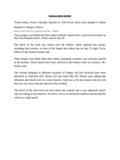So, you know, after the road accident , I spoke to a few people who saw the whole thing go down. Their stories are pretty consistent, and honestly, they paint a vivid, albeit terrifying, picture. John, who lives just on the corner , told me he was watering his plants when he heard a huge crash . He looked up just in time to see the blue sedan spinning and the truck trying desperately to brake. He said, “It was like slow motion. The car just came out of nowhere. The truck driver had no chance to avoid it.” Sarah, who was waiting at the bus stop nearby , echoed the sentiment. She mentioned hearing the screech of tires just before the impact. She added, “It was so loud, and then there was just… silence for a second, and then people started shouting.” She also noted how quickly the emergency services arrived. “I was amazed at how fast they were here. Within minutes, you could see the flashing lights.” Another witness, a delivery driver who was a few cars behind the sedan , explained that the blue car had been weaving in and out of traffic for a while. “He was definitely pushing it,” he said, “Trying to get past everyone. I thought to myself, ‘Someone’s going to get hurt,’ and then… boom.” These accounts are crucial because they provide a firsthand perspective on the events leading up to the road accident . They highlight the recklessness of one driver and the unfortunate consequences that followed. It’s easy to see accident reports in the news and feel detached, but hearing it from people who were right there makes it so much more real. It’s a stark reminder that behind every statistic is a human story, and in this case, it’s a story of a split-second decision that had major repercussions. The road accident serves as a powerful testament to the importance of responsible driving and the potential dangers of impatience on the road. We’ve all been in a hurry, right? But these firsthand accounts really drive home the point that it’s never worth risking your life or the lives of others. The collective experience of these witnesses underscores the need for greater vigilance and adherence to traffic laws. It’s not just about the letter of the law, but the spirit of it – looking out for each other, being patient, and understanding that we share these roads.