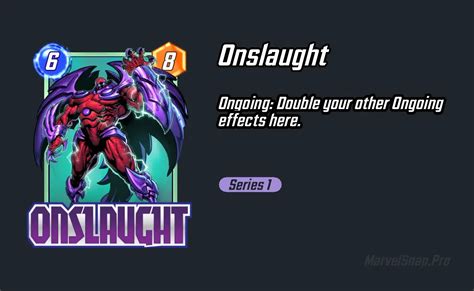 The beauty of Onslaught is his versatility. He can fit into various deck archetypes, amplifying the effects of different Ongoing cards. For example, if you have cards that provide a continuous power boost to other cards, Onslaught will make that boost even greater. Similarly, if you have cards that reduce the cost of other cards, Onslaught will double that reduction. This flexibility makes Onslaught a valuable asset in your Pool 1 collection. He can turn a moderate board state into an overwhelming advantage in a single turn.