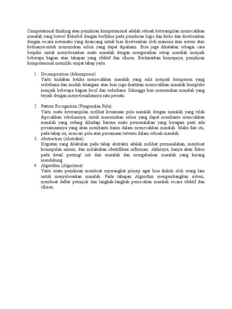 Jadi, computational thinking itu, guys, pada dasarnya adalah serangkaian proses pemecahan masalah yang diambil dari ilmu komputer. Tapi, jangan keburu takut mikir yang ribet ya. Anggap aja ini kayak resep masakan super lengkap buat ngadepin tantangan apa pun. Kita diajak buat memecah masalah besar jadi bagian-bagian yang lebih kecil, nyari pola-pola yang muncul, fokus pada informasi penting aja, dan bikin langkah-langkah atau algoritma yang jelas buat nyelesaiin masalah itu. Computational thinking ini melatih kita buat berpikir lebih logis, sistematis, dan kreatif. Ini bukan cuma soal coding atau ngertiin komputer, tapi lebih ke cara kita memandang dan menyelesaikan persoalan dalam kehidupan sehari-hari, baik itu di sekolah, kerjaan, atau bahkan pas lagi nyusun rencana liburan bareng teman-teman. Dengan menguasai proses ini, kita jadi lebih siap buat menghadapi dunia yang terus berubah dan makin kompleks. Bukannya keren tuh, punya skill yang bisa dipakai di mana aja? Jadi, jangan heran kalau banyak sekolah sekarang yang mulai masukin computational thinking ke dalam kurikulumnya. Ini investasi jangka panjang buat masa depan kita semua, guys !