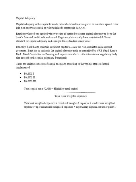 So, what exactly is the Capital Adequacy Ratio ? It’s a ratio that measures a bank’s available capital against its risk-weighted assets. Basically, it tells you how much capital a bank has relative to the risks it’s taking on. The formula is pretty straightforward: CAR = (Tier 1 Capital + Tier 2 Capital) / Risk-Weighted Assets . Let’s break that down a bit. Tier 1 capital is the core capital, the highest quality capital a bank possesses. This includes things like common stock and retained earnings. It’s the money that’s truly available to absorb losses without the bank having to cease operations. Then you have Tier 2 capital , which is supplementary capital. This includes things like hybrid capital instruments, subordinated debt, and general loan-loss reserves. While it offers less protection than Tier 1 capital, it still contributes to a bank’s ability to withstand losses. Risk-weighted assets are the assets on a bank’s balance sheet, but they’re not all treated equally. Assets with a higher risk of default are assigned a higher risk weight. For example, a loan to a highly stable government might have a very low risk weight, while a loan to a startup company in a volatile industry would have a much higher risk weight. The higher the risk weight, the more capital the bank needs to hold against that asset. The minimum CAR is set by regulatory bodies, and different jurisdictions might have slightly different requirements, but the core principle remains the same: ensure banks have enough cushion to weather economic storms. It’s a dynamic measure, meaning it needs to be calculated regularly to reflect the current financial health and risk profile of the institution. This ratio is a key indicator that investors, depositors, and regulators look at to gauge a bank’s financial strength and its ability to meet its obligations, even under stressful conditions. It’s all about preparedness and resilience in the face of uncertainty.
