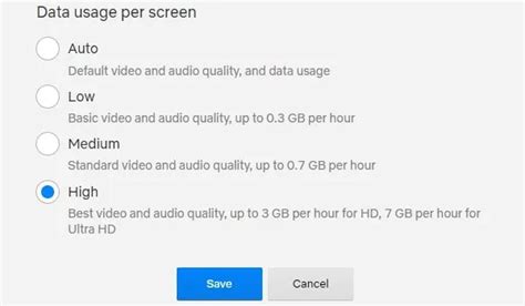 - High: This delivers the best picture quality, including HD and sometimes even 4K, depending on your subscription plan and device. This is the data hog, using up to 3 GB per hour or more for 4K content.