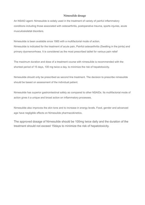 So, to recap, when your doctor prescribes Nimesulide , they’re essentially giving you a powerful ally to combat those annoying aches, swelling, and discomforts by targeting the root cause of the inflammatory response. It’s a fantastic option for short-term relief in many scenarios, but like any medication, knowing how and when to use it safely is absolutely paramount. Understanding its mechanism of action helps us appreciate why adherence to dosage frequency is so important to maintain its therapeutic effect and minimize risks. Remember, while it’s great at what it does, it’s not a magic bullet and comes with responsibilities for safe use. This foundation will help us better grasp why sticking to the recommended schedule for Nimesulide administration is non-negotiable for your well-being. It’s truly a game-changer for many conditions involving pain and inflammation, but only when used correctly and under professional guidance. The benefit-risk profile of Nimesulide is carefully weighed by healthcare professionals, who consider factors unique to each patient before prescribing. This ensures that you receive the most appropriate and safest treatment for your specific needs, emphasizing the importance of a detailed consultation with your doctor before starting or continuing any course of Nimesulide.