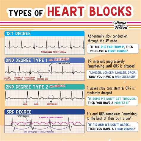 As mentioned earlier, a prolonged PR interval (greater than 0.20 seconds) is characteristic of first-degree AV block. In this type of heart block, all atrial impulses eventually reach the ventricles, but the conduction is delayed at the AV node. While first-degree AV block is usually asymptomatic, it can sometimes progress to more severe forms of heart block. Second-degree AV block is characterized by intermittent failure of atrial impulses to reach the ventricles. There are two main types of second-degree AV block: Mobitz type I (Wenckebach) and Mobitz type II. In Mobitz type I, the PR interval progressively lengthens with each successive beat until a beat is dropped altogether. This pattern of progressive PR interval prolongation followed by a dropped beat is a hallmark of Wenckebach block. In Mobitz type II, the PR interval remains constant, but there are intermittent non-conducted P waves, meaning that some atrial impulses fail to reach the ventricles without any preceding PR interval prolongation. Mobitz type II is generally more serious than Mobitz type I, as it is more likely to progress to complete heart block. Third-degree AV block, also known as complete heart block, is the most severe form of heart block. In this condition, there is complete dissociation between the atria and ventricles, meaning that no atrial impulses reach the ventricles. The atria and ventricles beat independently of each other, with the ventricles usually driven by an escape rhythm originating from the AV node or the His-Purkinje system. Complete heart block is a life-threatening condition that requires immediate treatment, typically with a pacemaker.