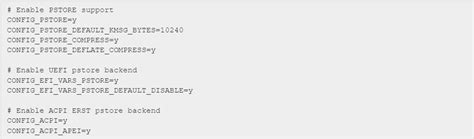 1. Kernel Configuration: First, you need to make sure that the pstore driver is enabled in your kernel configuration. This typically involves enabling the CONFIG_PSTORE option, as well as options for the specific storage backend you want to use (e.g., CONFIG_PSTORE_RAM , CONFIG_PSTORE_FSL , etc.). You may need to recompile your kernel after making these changes.