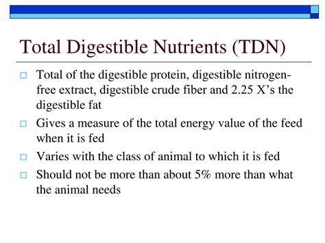 So, what exactly is TDN ? In a nutshell, Total Digestible Nutrients represents the total amount of energy an animal can derive from a feedstuff. Think of it as the fuel gauge for your animal’s body. TDN is expressed as a percentage, indicating the proportion of the feed that an animal can digest and absorb for energy. This energy fuels everything from basic bodily functions to growth, reproduction, and physical activity. Basically, it’s a measure of the available energy in a feed. To be more precise, TDN is calculated by summing up the digestible components of a feed, including crude protein, nitrogen-free extract (primarily carbohydrates), crude fiber, and fat (multiplied by a factor to account for its higher energy density). This calculation provides a single value that gives you a quick and easy way to compare the energy content of different feedstuffs. This makes it a super useful tool for nutritionists and farmers alike.